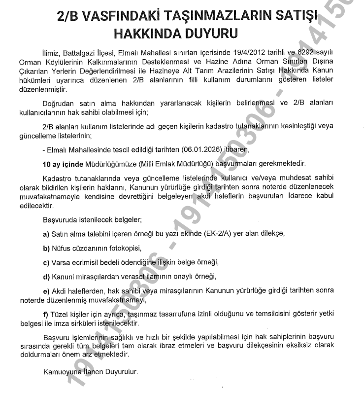 Battalgazi İlçesi Beydağı Mahallesinde bulunan 2/B alanlarının fiili kullanım durumlarını gösteren kullanım listeleri hakkında