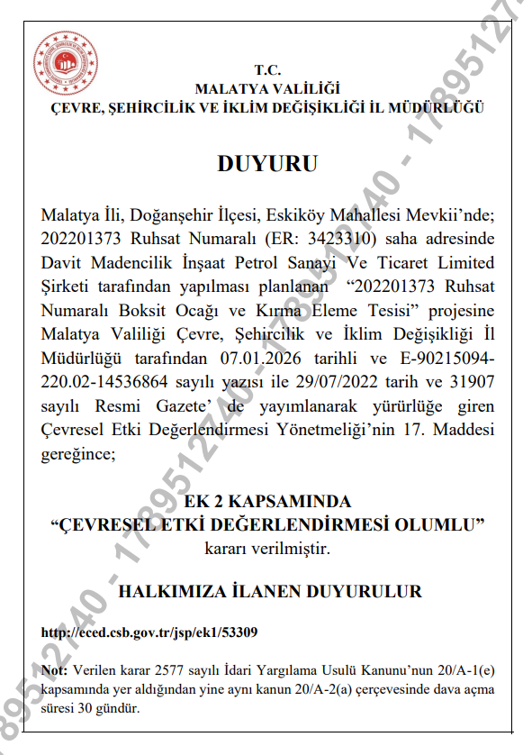 Doğanşehir İlçesi, Eskiköy Mahallesi Mevkii'nde Davit Madencilik İnşaat Petrol Sanayi Ve Ticaret Limited Şirketi tarafından yapılması planlanan "202201373 Ruhsat Numaralı Boksit Ocağı ve Kırma Eleme Tesisi" hakkında.