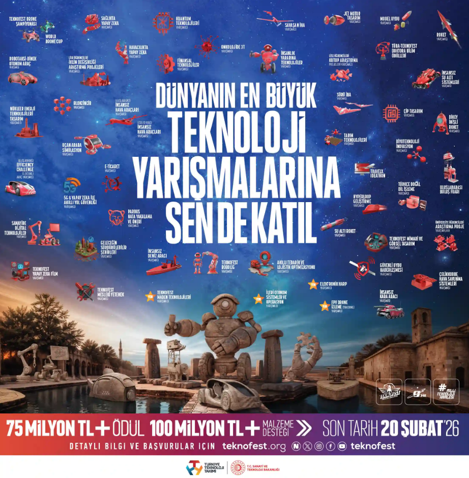 Dünyanın en büyük havacılık, uzay ve teknoloji festivali TEKNOFEST kapsamında düzenlenen 2026 yılı teknoloji yarışmalarına başvurular başladı. Bu yıl yeni adresi Şanlıurfa olan TEKNOFEST, 75 milyon TL ödül ve 100 milyon TL’den fazla maddi desteğiyle genç zihinleri yeni keşiflere davet ediyor. Fikirleri projeye, projeleri geleceğe dönüştürmek isteyenler için yarışma başvuruları ise 20 Şubat’a kadar devam ediyor!.