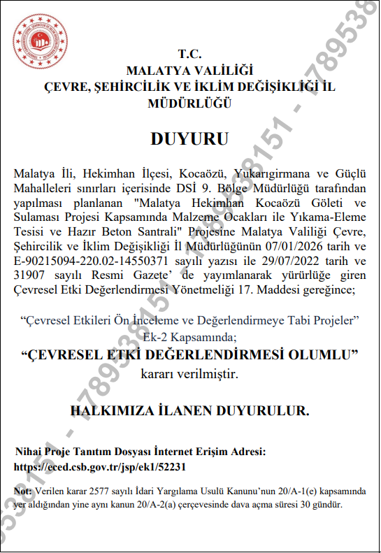 Hekimhan İlçesi, Kocaözü, Yukarı girmana ve Güçlü Mahalleleri sınırları içerisinde DSİ 9. Bölge Müdürlüğü tarafından yapılması planlanan "Malatya Hekimhan Kocaözü Göleti ve Sulaması Projesi hakkında.