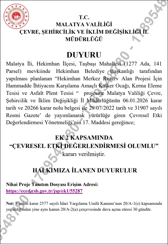 Hekimhan İlçesi, Taşbaşı Mahallesi (1277 Ada, 141 Parsel) mevkiinde Hekimhan Belediye Başkanlığı tarafından yapılması planlanan "Kalker Ocağı, Kırma Eleme Tesisi ve Asfalt Plent Mix Tesisi projesi hakkında.