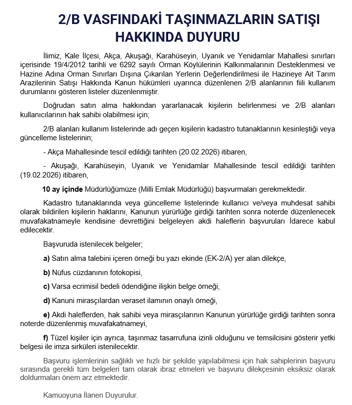 Kale İlçesi Akça ,Akuşağı, Karahüseyin ,Uyanık ,Yenidamlar mahallerinde bulnan 2/B alanlarının fiili kullanım durumlarını gösteren kullanım listeleri hakkında.