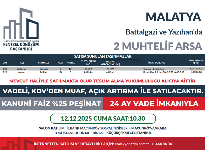 Kentsel Dönüşüm Başkanlığı tarafından 12 aralık 2025 tarihinde saat 10:30 da Malatya da 2 muhtelif arsa satışı yapılacaktır.İlanen duyurulur.