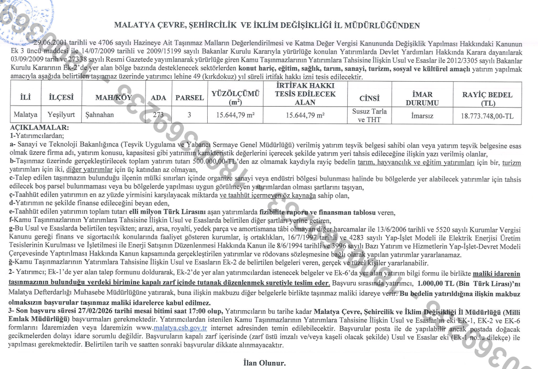 Malatya İli Yeşilyurt İlçesi Şahnahan mahallesinde bulunan Maliye Hazinesine ait taşınmazın irtifak izni hakkında.