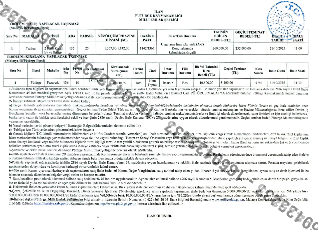 Pütürge İlçesinde bulunan Hazineye ait taşınmazlarınn satış ve kiralama ihalesi hakkında.