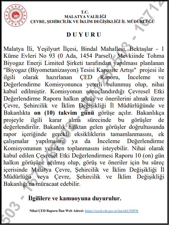 Yeşilyurt İlçesi, Bindal Mahallesi, Bektaşlar - 1 Küme Evleri No 93 (0 Ada, 1454Parsel) Mevkiinde Tohma Biyogaz Enerji Limited Şirketi tarafından yapılması planlanan "Biyogaz(Biyometanizasyon) Tesisi Kapasite Artışı" projesi hakkında.