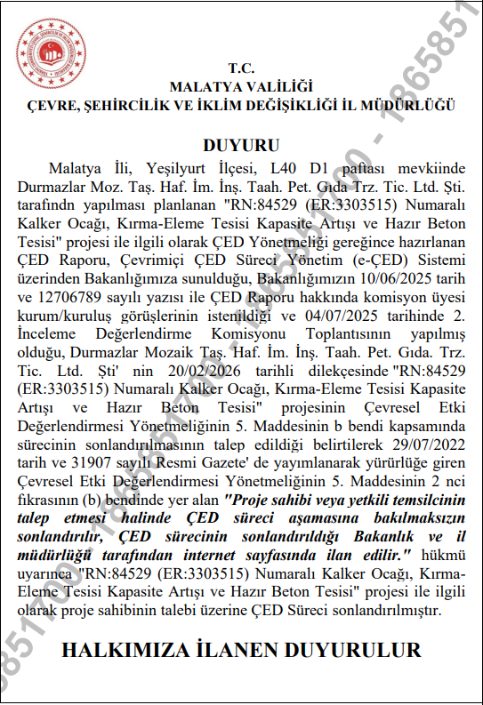 Yeşilyurt İlçesi, L40 D1 paftası mevkiinde Durmazlar Moz. Taş. Haf. İm. İnş. Taah. Pet. Gıda Trz. Tic. Ltd. Şti. tarafından yapılması planlanan Kalker Ocağı, Kırma-Eleme Tesisi Kapasite Artışı ve Hazır Beton Tesisi projesi hakkında.
