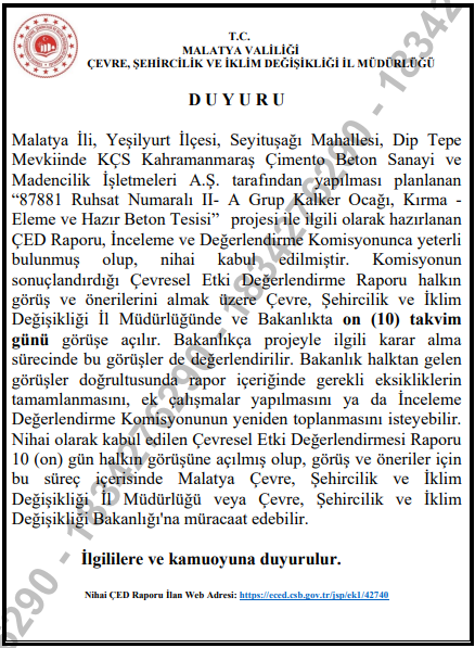 Yeşilyurt İlçesi, Seyituşağı Mahallesi, Dip Tepe Mevkiinde KÇS Kahramanmaraş Çimento Beton Sanayi ve Madencilik İşletmeleri A.Ş. tarafından yapılması planlanan proje hakkında.